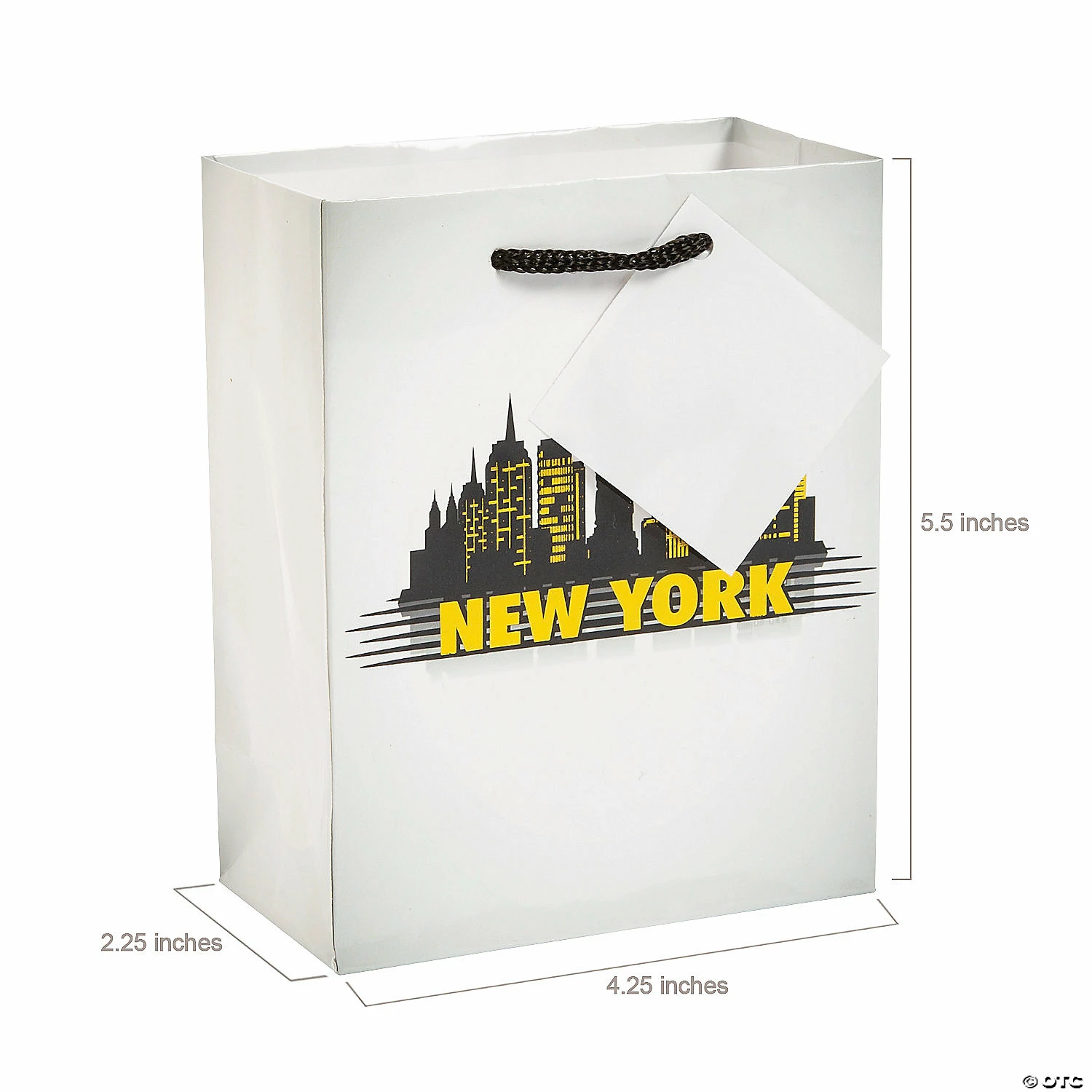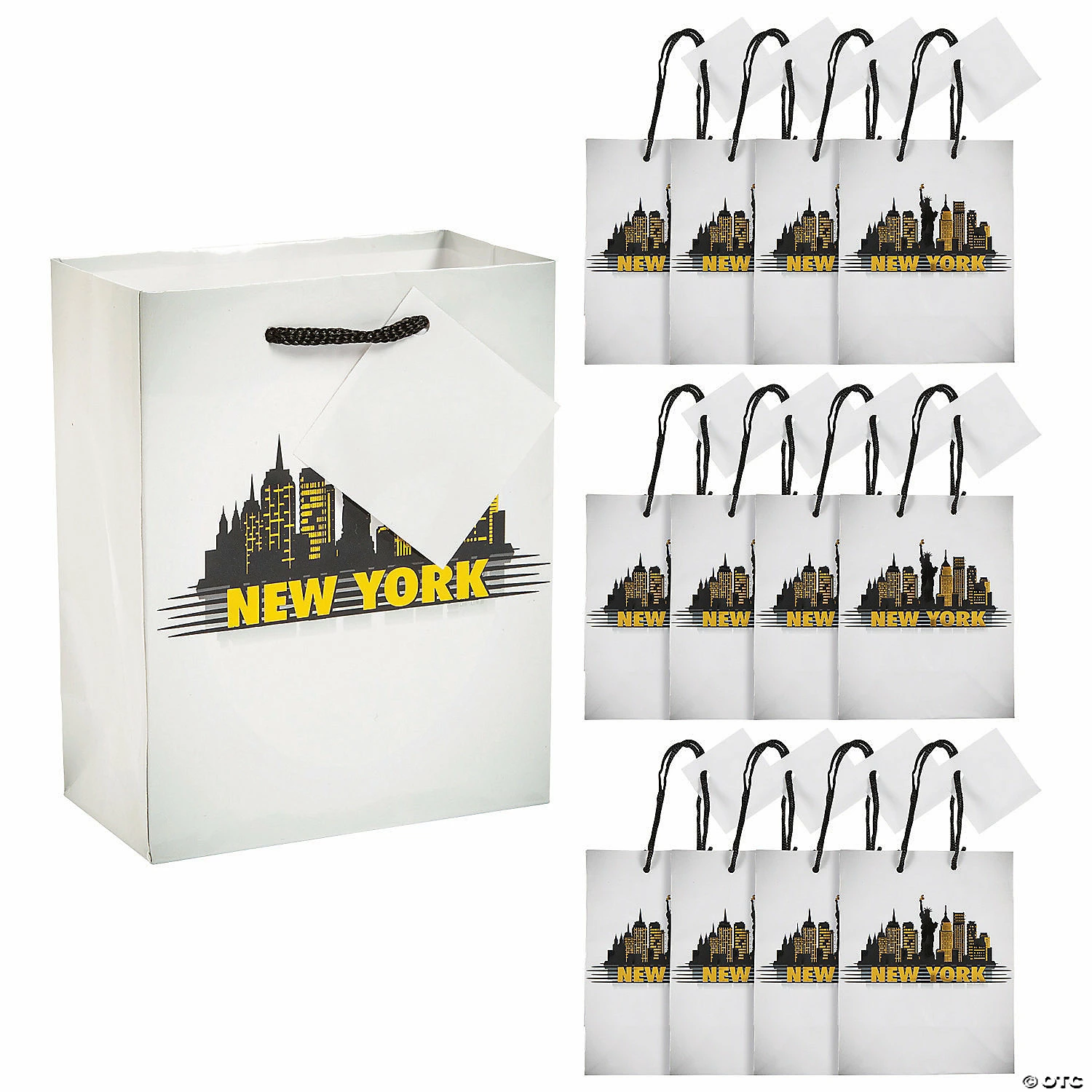 • Reusable: Go green with these eco-friendly gift bags! They could even be reused for future gifts.• Easy Gift Wrapping: These sturdy gift bags are suitable for holding a variety of presents and come with easy-to-carry handles. They make wrapping any gift easy breezy!• Quality: These stylish gift bags are sure to make your present stand out from the pack. Just add some tissue paper for a beautiful gift presentation!Product Description:Sure, these bags may look small, but when filled with party favors, they’ll seem as grand as the Big Apple! Perfect when planning a big city-themed homecoming, prom or corporate event, these gift bags come printed with a black and shimmering gold design of New York. Now even if you’re stuck in a fly over state, bring all the excitement of the biggest city to your celebration! Paper. 4 1/4″ x 2 1/4″ x 5 1/2″ with 3″ handles. © OTCSize: 4 1/4″ x 2 1/4″ x 5 1/2″ with 3″ handles.Quantity: 12Material: Paper with plastic window.