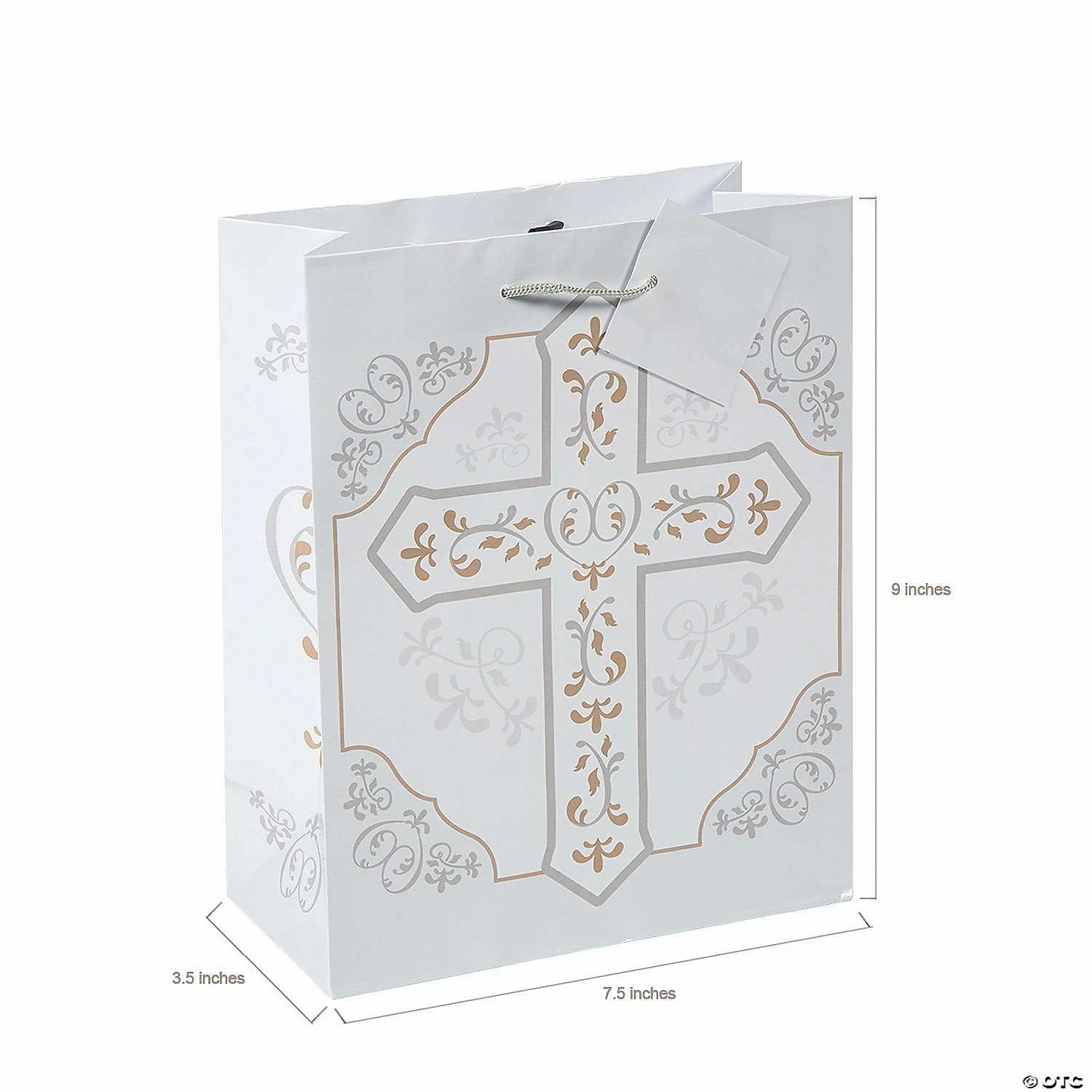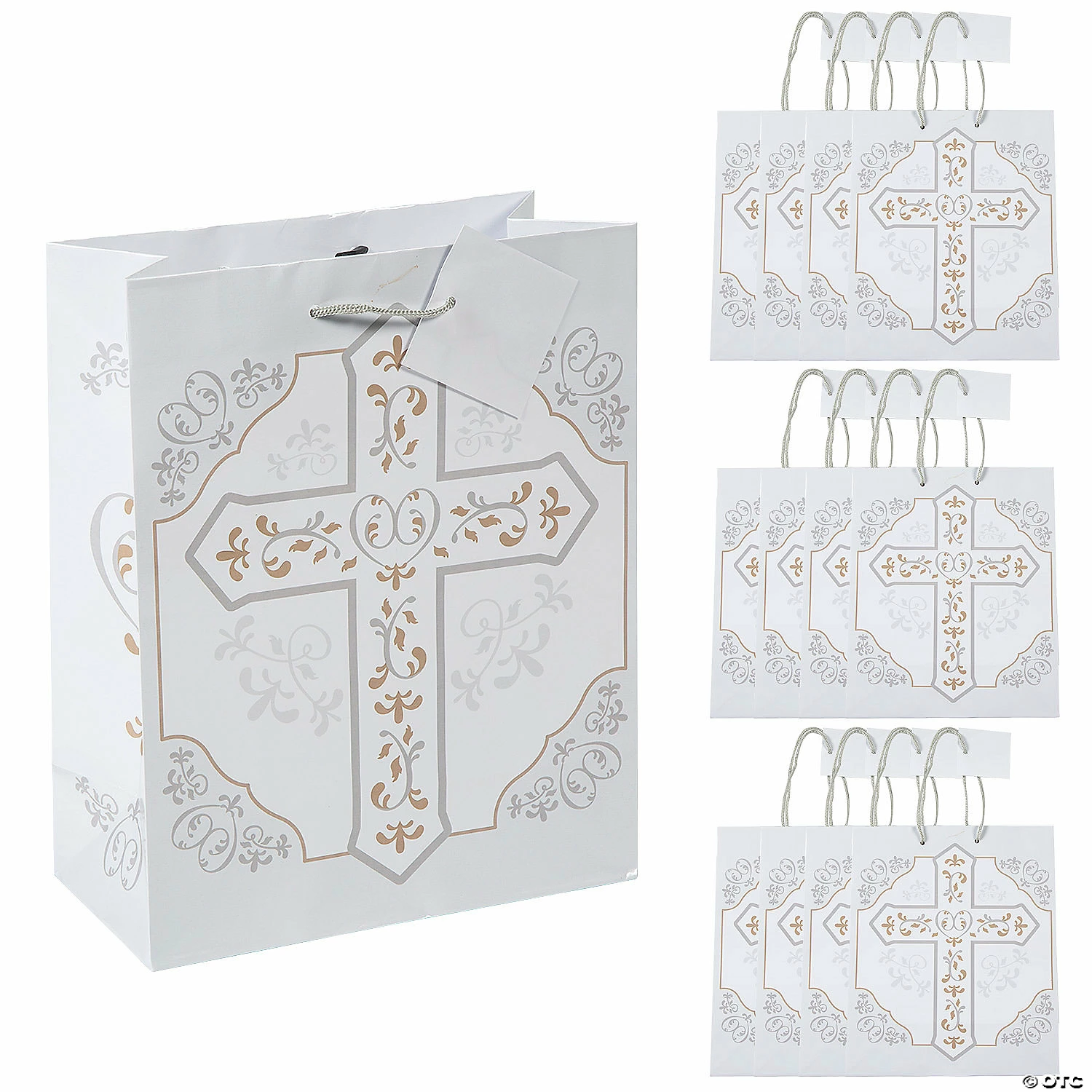 β’ Reusable: Go green with this eco-friendly gift bag! Reuse these bags for holiday gifts next year.β’ Easy Gift Wrapping: These sturdy holiday gift bags are suitable for holding a variety of presents and come with easy-to-carry handles. They make wrapping any gift easy breezy!β’ Quality: These stylish gift bags are sure to make your holiday present stand out from all the other gifts. Just add some tissue paper (sold separately) for a beautiful gift presentation!Product Description:Make sure your religious gifts are properly wrapped in these must-have gift bags. A great addition to party supplies, these versatile gift bags with nylon handles have a delicate silver cross design and are perfect for baptism gifts, wedding gifts, confirmation gifts, thoughtful giveaways and more! Β© OTCSize: 7 1/2″ x 3 1/2″ x 9″ with 4″ handlesQuantity: 12Material: Paper.