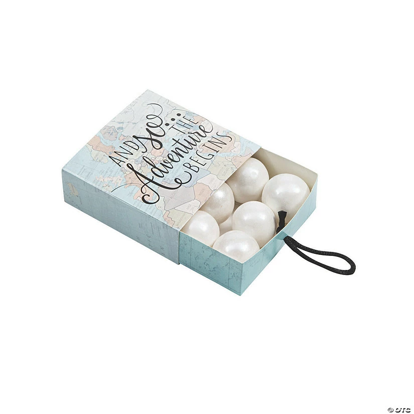 These versatile pull boxes are perfect for wedding receptions and can even be used for graduation parties! Printed with “And so the adventure begins” on top of a map of the world. Cardstock. (2 dozen per unit) 3″ x 3″ x 1″ Simple assembly required. Β© OTC