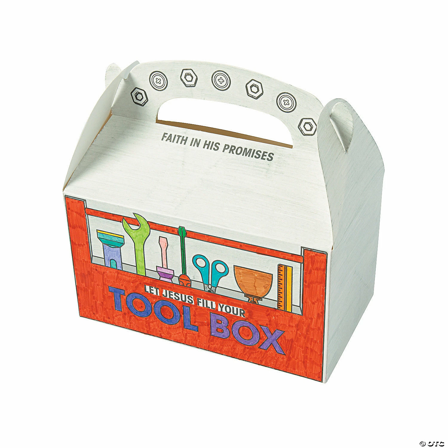 These cute treat boxes are ready for coloring and feature images and messages from Construction VBS. Kids will enjoy coloring the boxes and leaders will enjoy the easy prep and clean-up involved in this simple art project. On the last day of Construction VBS, hand these boxes back out filled with goodies youโll find here on our website. Cardstock. 6 1/4″ x 3 1/2″ x 3 1/4″ with handle. Simple assembly required. ยฉ OTC