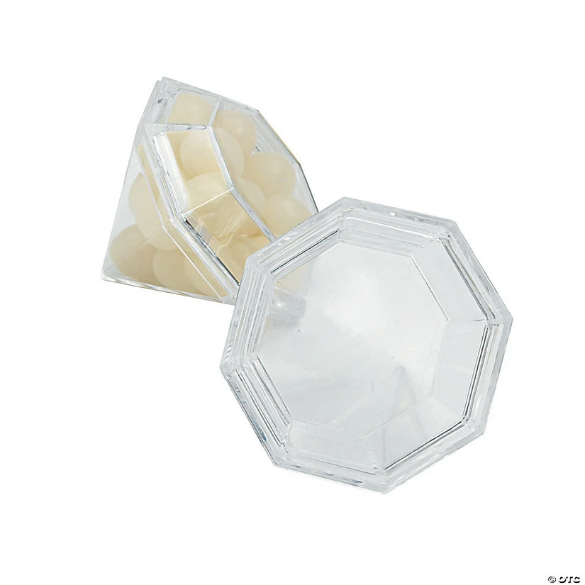 These adorable gem-shaped boxes make great containers for wedding reception favors! They would be equally sweet for a Sweet 16 party, milestone anniversary or other special occasion. Fill each diamond-shaped box with memorable party favors or sweets to give guests a special take-home treat. Looking for more unique finds? Just search our website for tons more affordable options! Plastic. (2 dozen per unit) 2 1/8″. Simple assembly required. Β© OTC