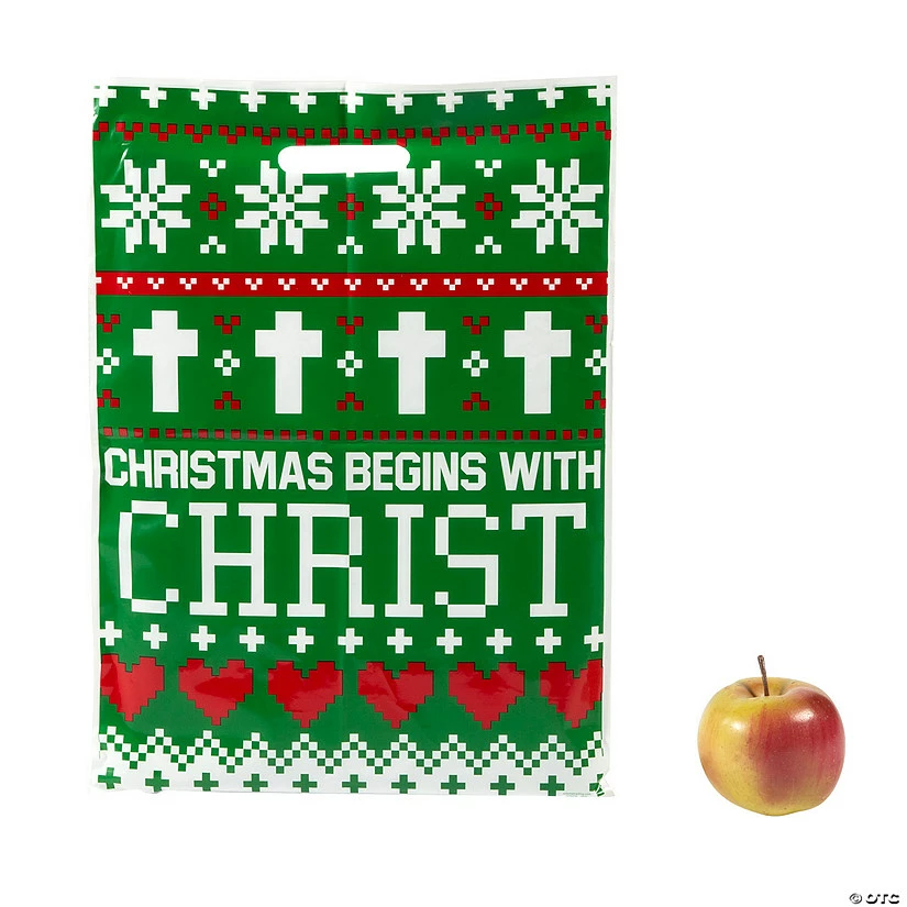 Make a faith statement with these cute goody bags featuring an ugly sweater print and the message “Christmas begins with Christ” across the front. Great as goody bags for a Christmas party or for handing out holiday bags to co-workers, friends or family, these cute bags feature an ugly sweater design and faith-filled messaging. Plastic. (50 pcs. per unit) 12 1/2″ x 17″ with cutout handles. © OTC
