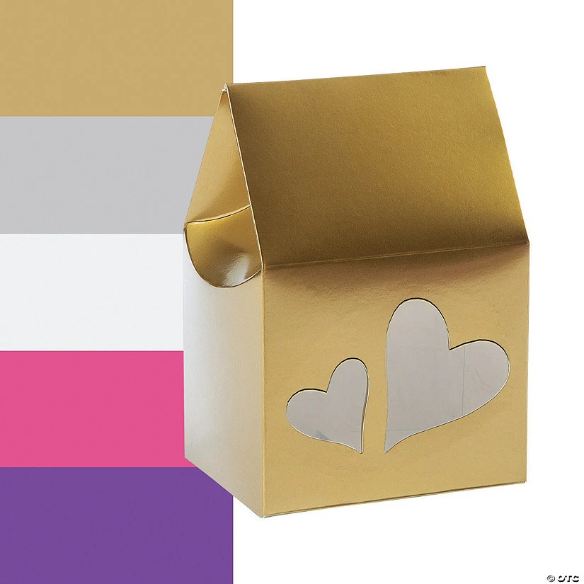 Pack up your wedding favors in style with these uniquely shaped favor boxes! With clear heart-shaped cutouts that allow the goodies inside to show through, these favor containers are perfect for holding sweets and treats and baked yummies. Add these boxes to your wedding supplies and reception supplies and use them as part of your table settings or even your centerpieces! Cardstock with plastic windows. 4″ x 3″ x 6″ Simple assembly required.
