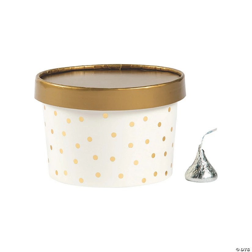 Looking for unique favor boxes for your wedding or event? These gold polka dot boxes each have a lid so you can pre-fill them with your favorite treats and favors or set them near your snack bar for guests to grab a few bites for the road! Cardstock. 3″ x 4″ diam.