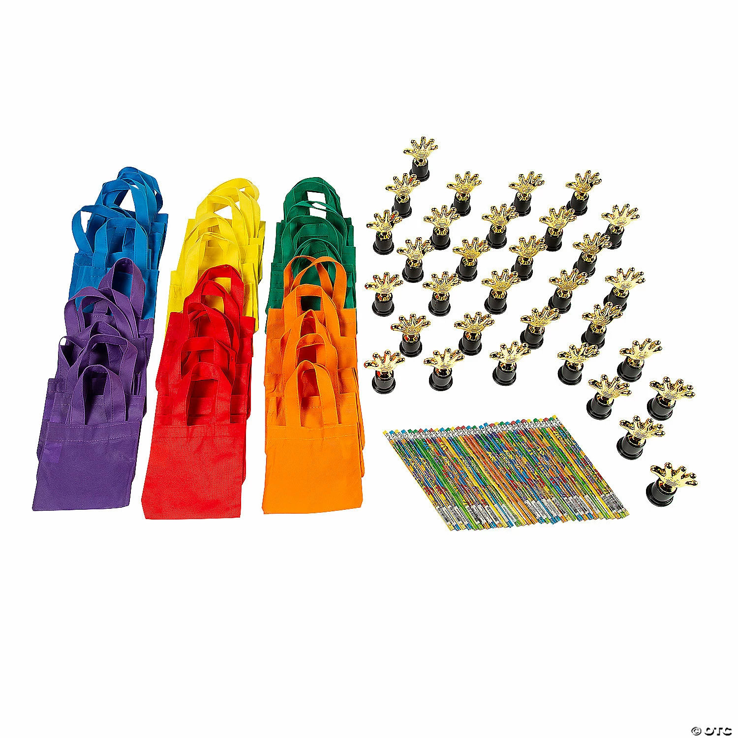 Fill these tote bags with the included bookmarks, pencils and trophies for DIY swag bags that will delight your students! Essential school supplies combined with fun treats are a great way to encourage kids to keep up the good work. Hand them out as rewards, Halloween treats or just as a way to show your children that you appreciate their best efforts! Enough for 30 students. Pencils have #2 lead. (120 pcs. per unit) Assortment may vary. Simple assembly required. ยฉ OTC