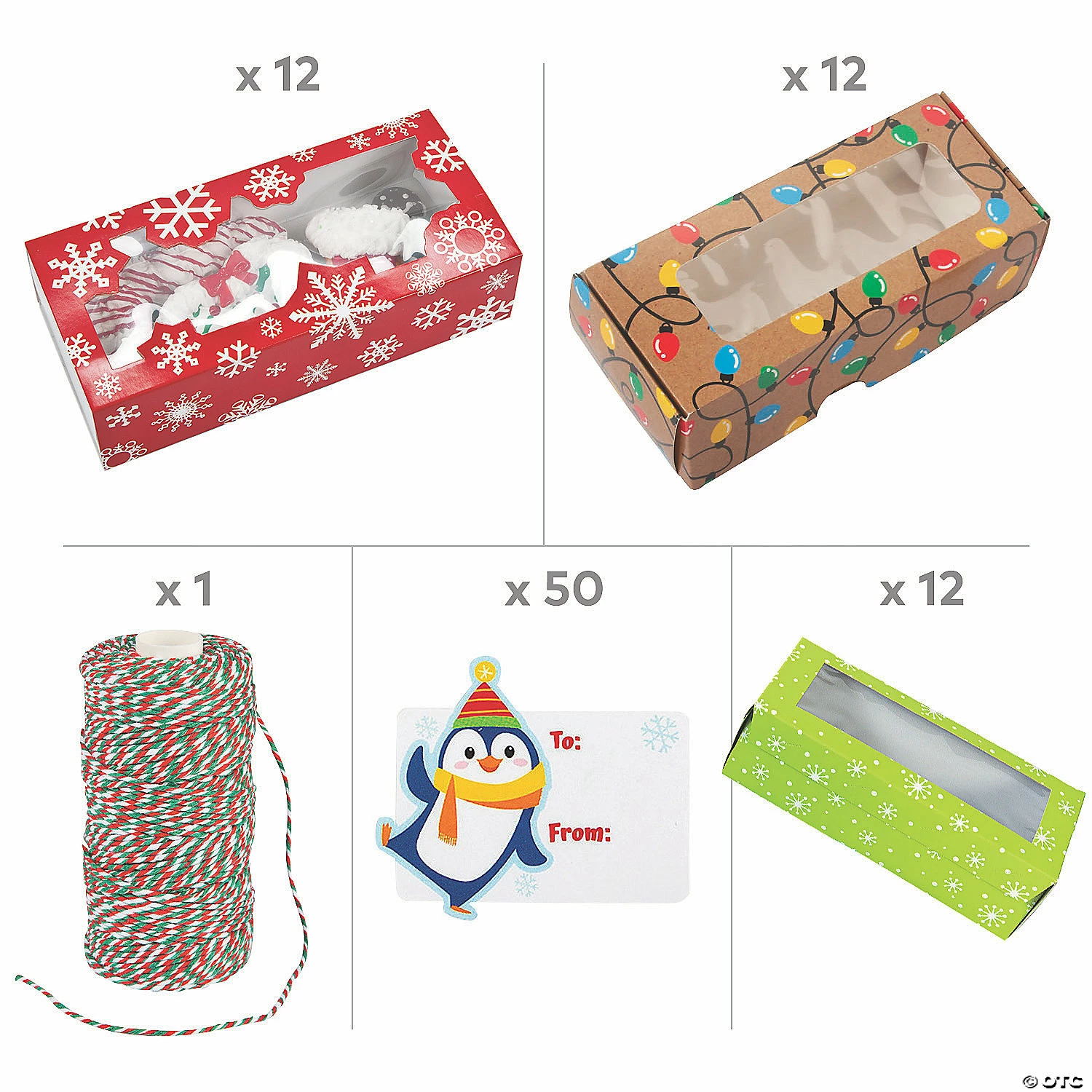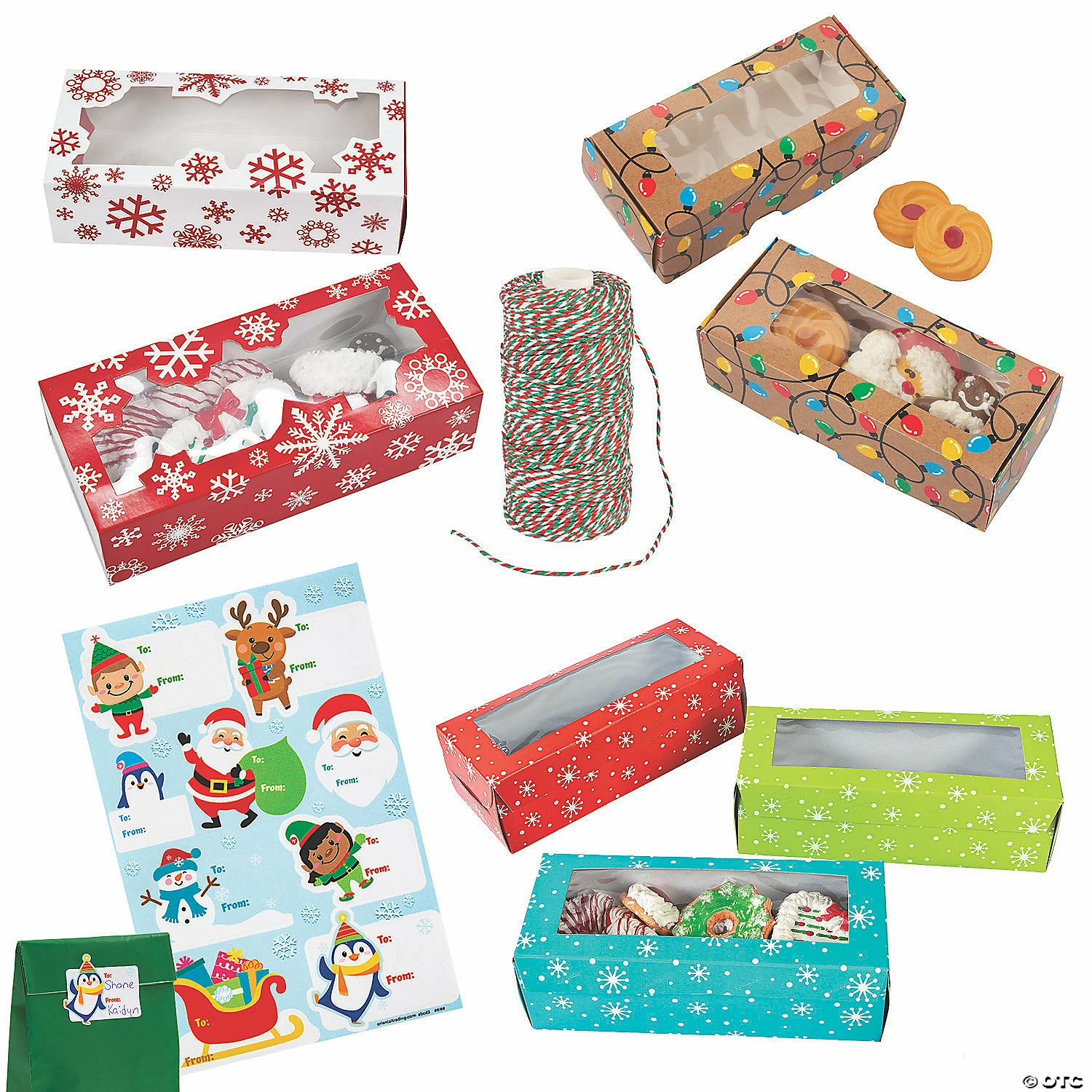 Deliver all of those delicious Christmas cookies and other holiday baked goods in style! When youβve been hard at work in the kitchen baking treats as beautiful as they are tasty, you donβt want their packaging to fall flat. This kit features a variety of colorful boxes, along with festive gift tags and twine to pull your look together. Holiday baking never looked so good! (87 pcs. per unit) Assortment may vary.Includes:β’ 1 Cotton Christmas Bakerβs Twine (328 ft.) β’ 12 Cardstock Holiday Cookie Boxes (8″ x 3″ x 2-1/2″ Simple assembly required)β’ 50 Paper Christmas Treat Stickers (9 stickers per sheet; 2 1/2″)β’ 12 Cardstock Holiday Lights Cookie Boxes (7″ x 3″ x 2″ Simple assembly required.)β’ 12 Cardstock Red & White Snowflake Cookie Boxes (Each with a cellophane window. 7″ x 3 1/4″ x 2″ Simple assembly required.)