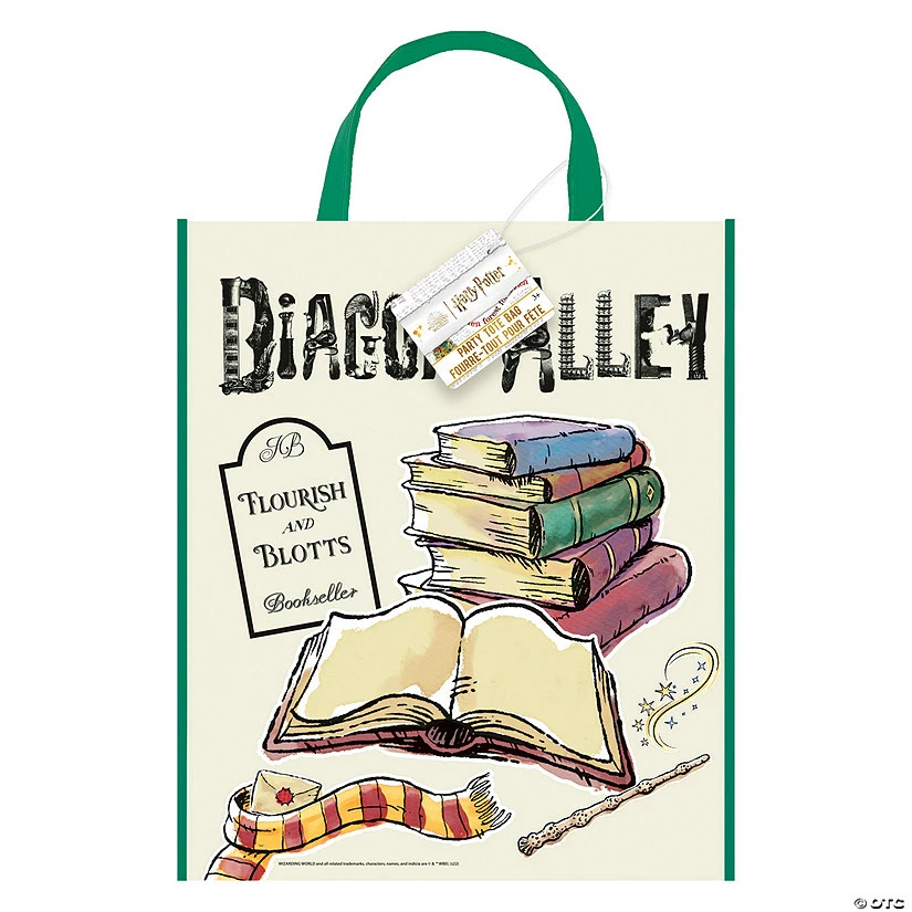 Looking for the perfect favor bag for your Harry Potterβ’ themed birthday party? You found it! Featuring images of books, a wand, a Gryffindor scarf, Hogwarts letter and the words, βDiagon Alley,β and, βFlourish and Blotts Bookseller,β this plastic tote has all the enchanting appeal of a charming favor bag! This favor bag is large enough to fit any party favors (sold separately) and reusable so guests can enjoy the bag even after the party is over! Plastic. 11″ x 13″ with handles. β’/Β© Warner Bros. Entertainment Inc.