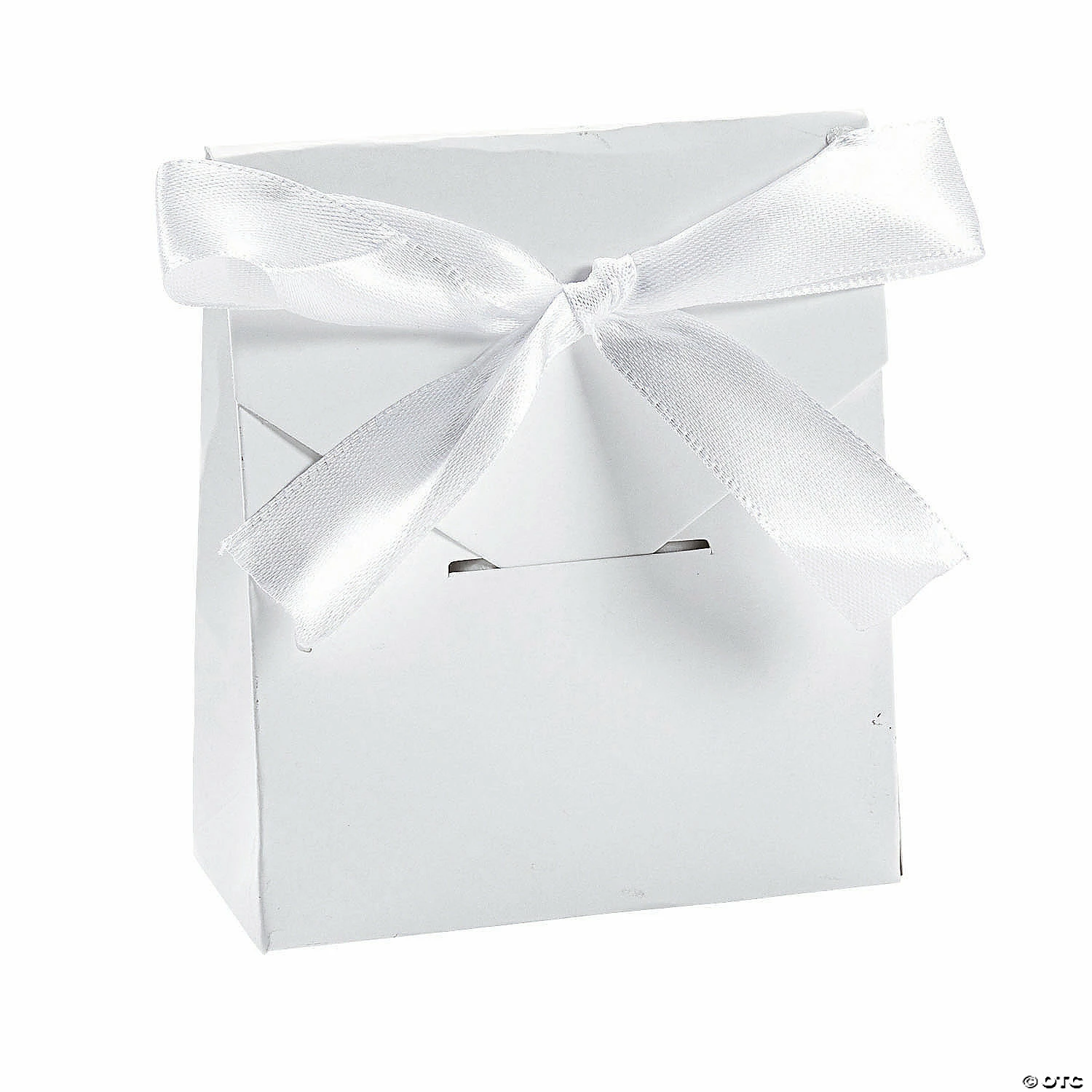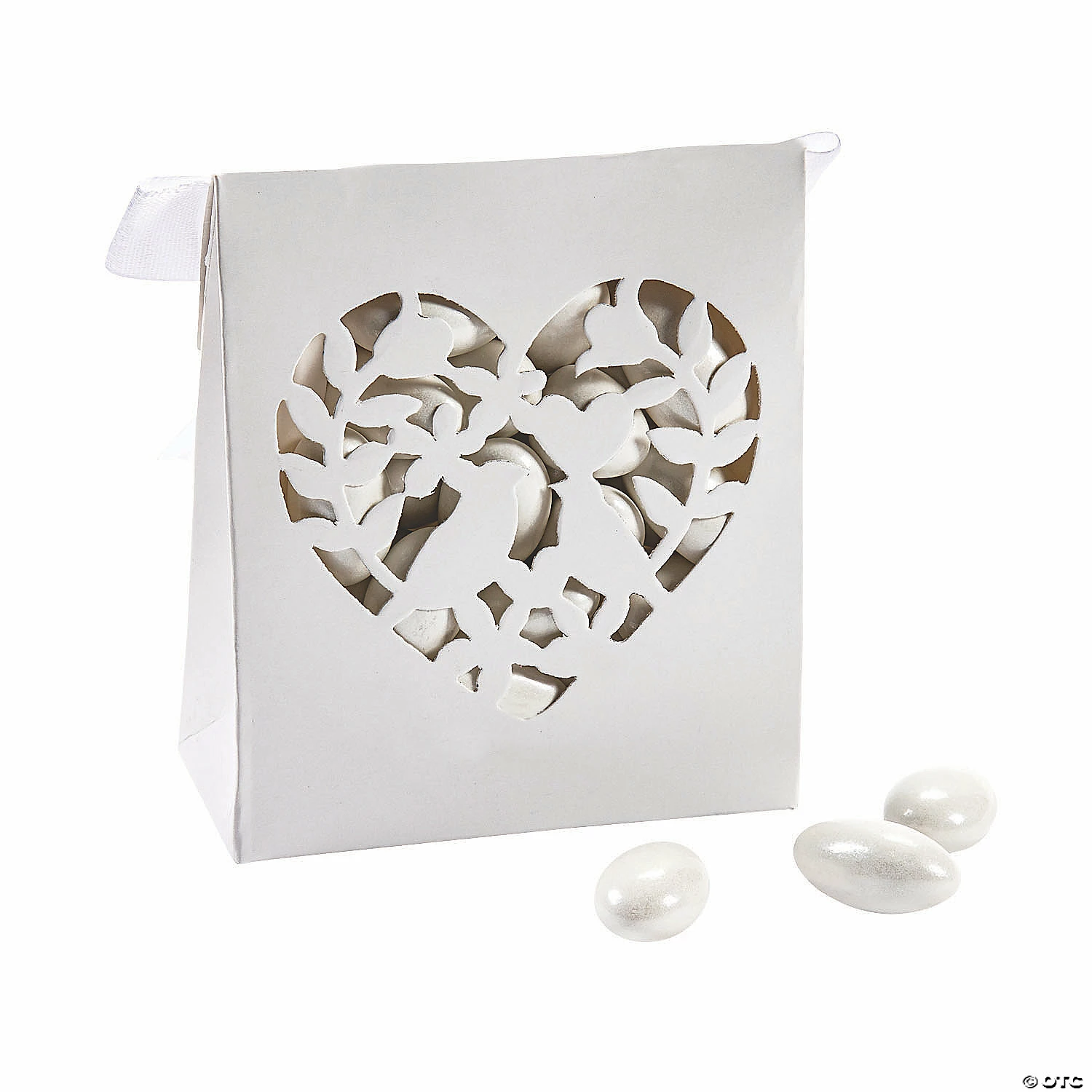 Send guests home with sweet treats in these beautiful laser cut favor boxes with ribbon. Two beautiful love birds are laser cut into the side of the box, making these perfect for wedding favors and bridal showers. Fill with wrapped candy or other wedding favors you can find throughout our site. Includes pre-tied satin ribbon. Cardstock. (2 dozen per unit) 3 1/2″ x 1 1/2″ x 4″ Simple assembly required.
