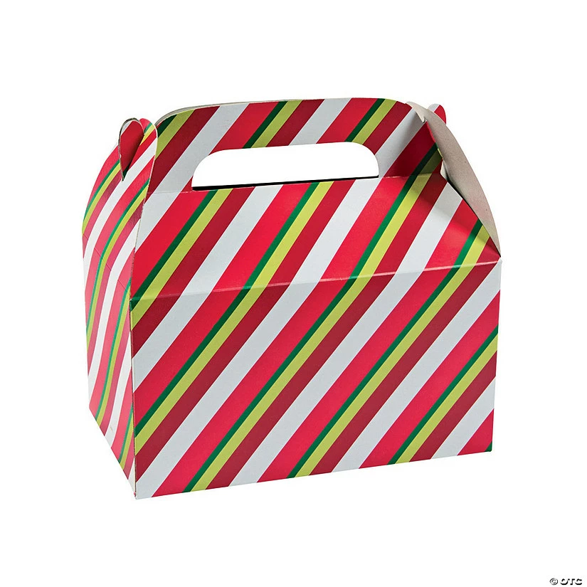 Bring a happy holiday style to your gift wrapping! Dress up your Christmas gifts or treats in these festive treat boxes. Featuring a red, green and white stripe design, these boxes give a decorative touch to small gifts and individually wrapped Christmas candy or treats (sold separately on this site). Paper. 8″ x 4 3/4″ x 5 1/4″ Simple assembly required. Β© OTC